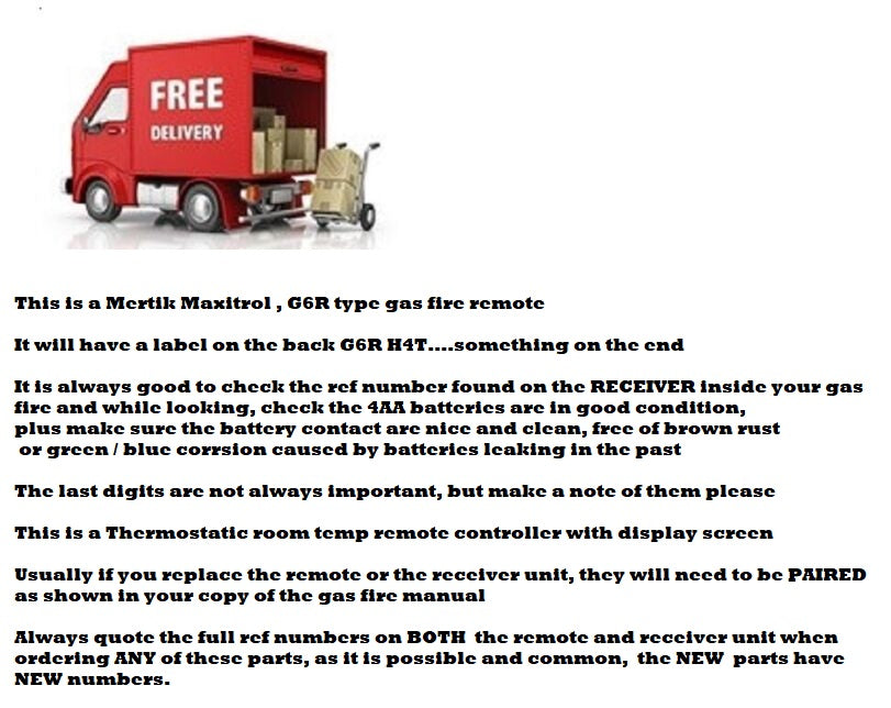 Mertik gas fire G6R H4T5 remote control. Simply check your original remote says G6R H4T5 on the remote label and this will be an exact original replacement made in Germany for your remote controlled gas fire, even if you have some Logo / brand name printed on the front of your remote. Top Tip, check the receiver box inside your gas fire has nice clean battery terminals which are free of corrosion from battery leaks as this will very often prevent your gas fire from working correctly, do not be tempted to clean the receiver box terminals as the internal PCB unit will also be damaged and may cause malfunction of your fire , even when unattended.